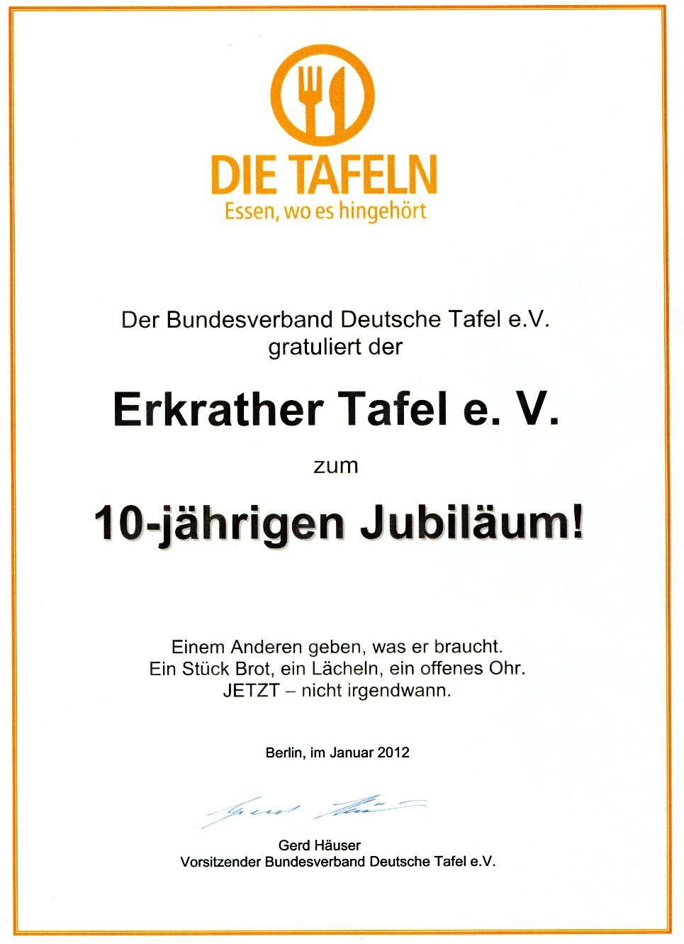 Zum 10-jährigen Jubiläum wurde die Erkrather Tafel e. V. vom Bundesverband Deutsche Tafel e. V. geehrt: